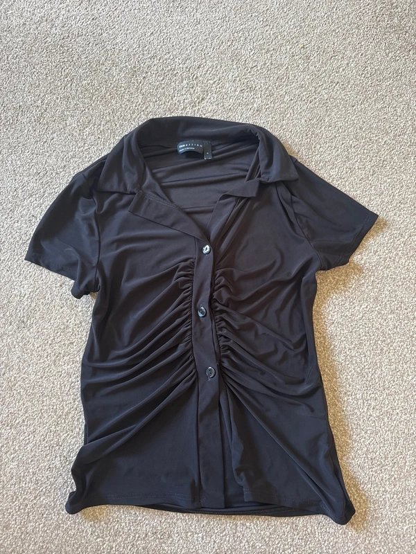 This ruched black top by ASOS features a fitted silhouette with button closures down the front. The collar adds a touch of elegance, making it perfect for a variety of occasions.