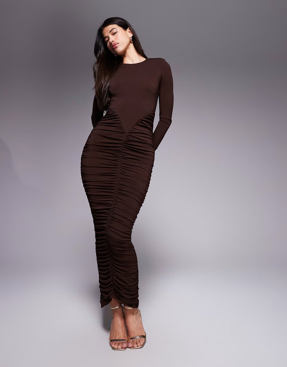 The ASOS Sculpting Ruched Detail Bodycon Maxi Dress in Chocolate is available in sizes XXXL, XXL, XL, XS, L, M, S.