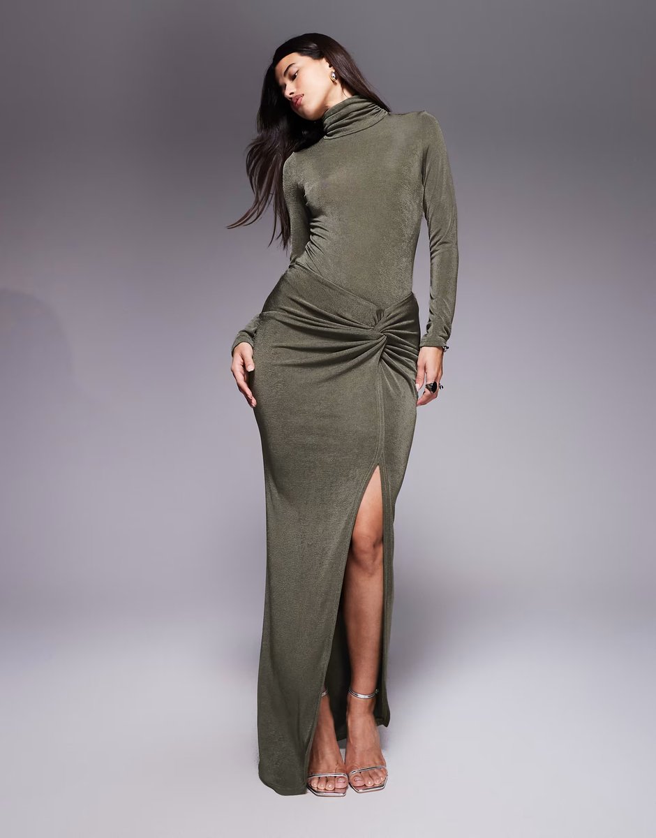 The ASOS Ruched & Ready Sculpted Textured Maxi Skirt in Olive Green is ideal for evening, night out.