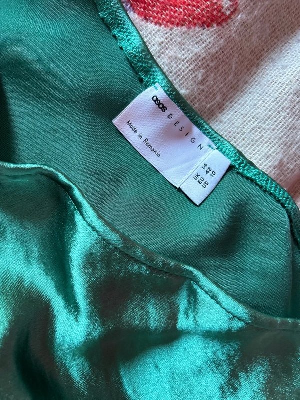 This stunning emerald green satin bias mini skirt by ASOS features a sleek silhouette with an elegant waist detail, perfect for adding a touch of glamour to any outfit.
