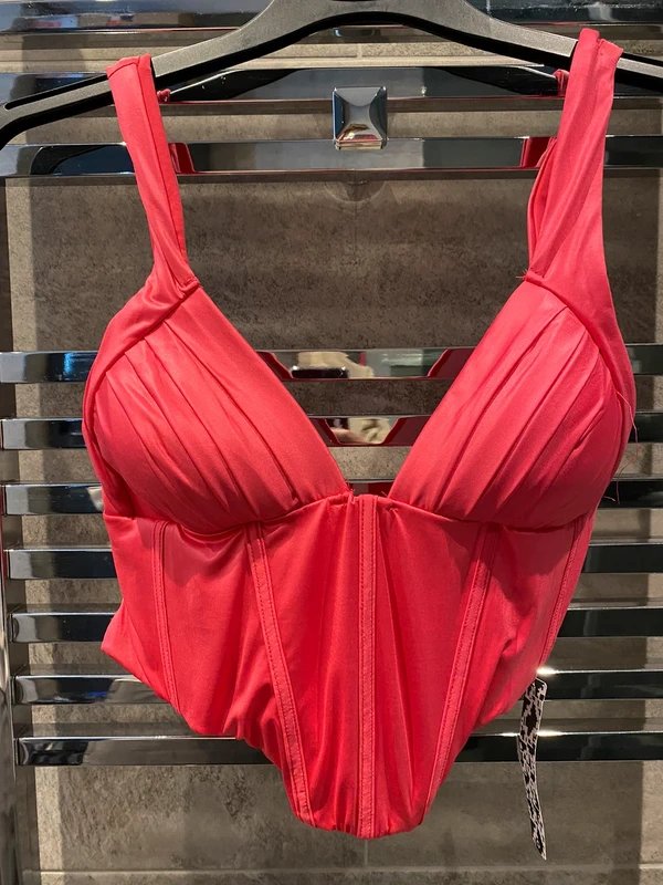 Crafted with pink satin, this corset-style bikini top by ASOS LUXE offers a flattering fit. The high neckline and adjustable straps add to its versatility.