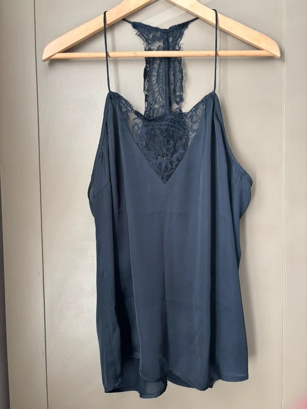 The ASOS Navy Lace Camisole with Silky Material is available in sizes XXXL, XXL, XL, XS, L, M, S.