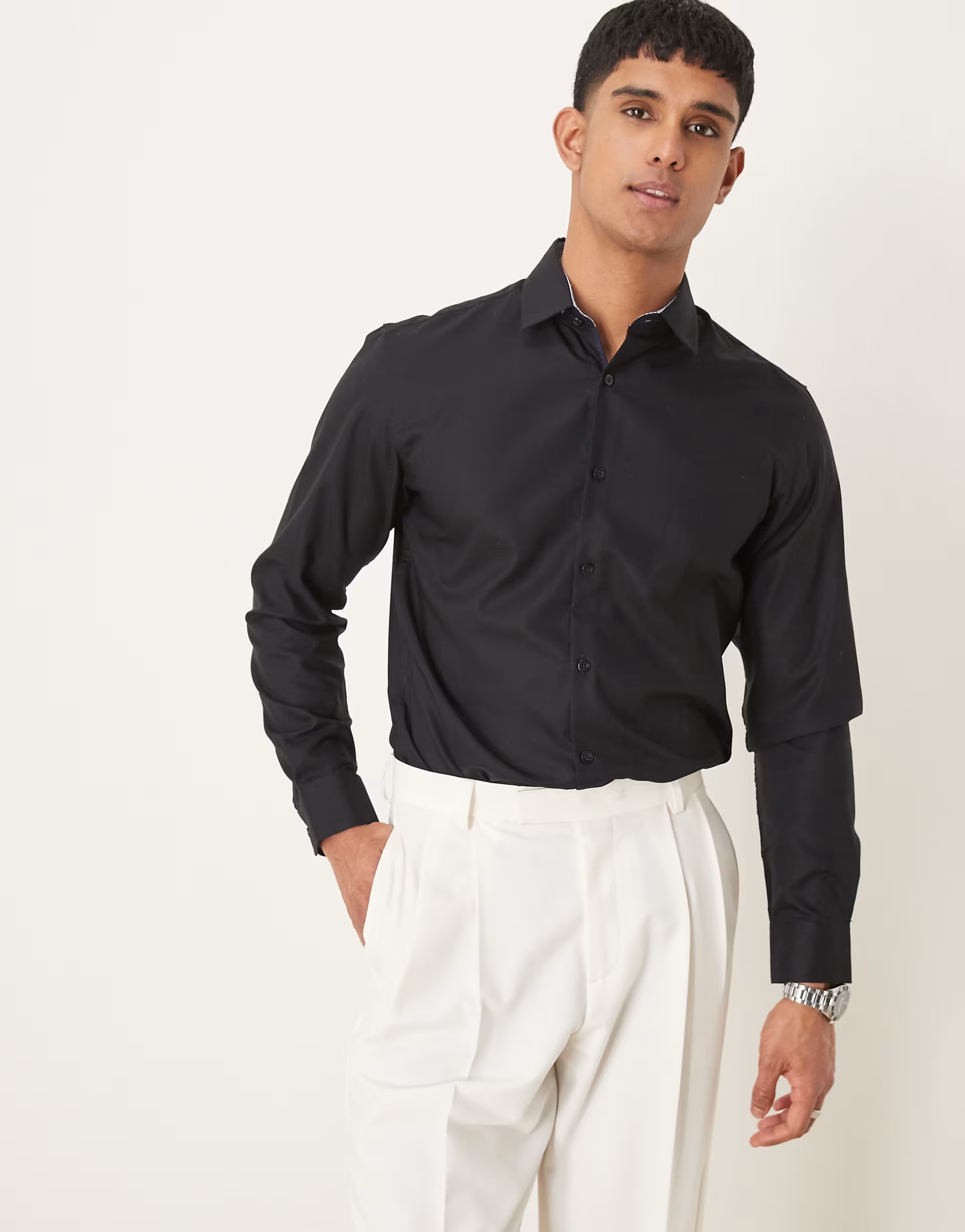 The ASOS Slim Fit Easy Iron Smart Shirt in Black is made from easy-iron fabric.