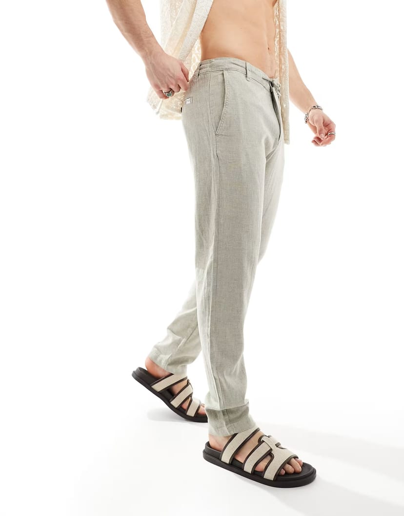 These cream-colored, slim tapered trousers from ASOS are crafted from linen, offering a comfortable yet stylish fit. Ideal for casual and smart-casual occasions.