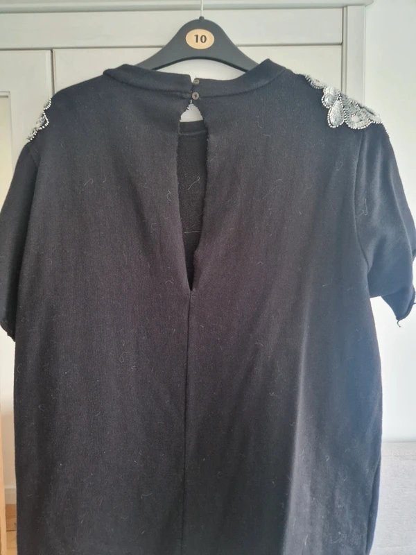 Designed in black, this high neck jumper dress features sequin embellished shoulders and an open back. It sits above the knee and fits UK size 16.