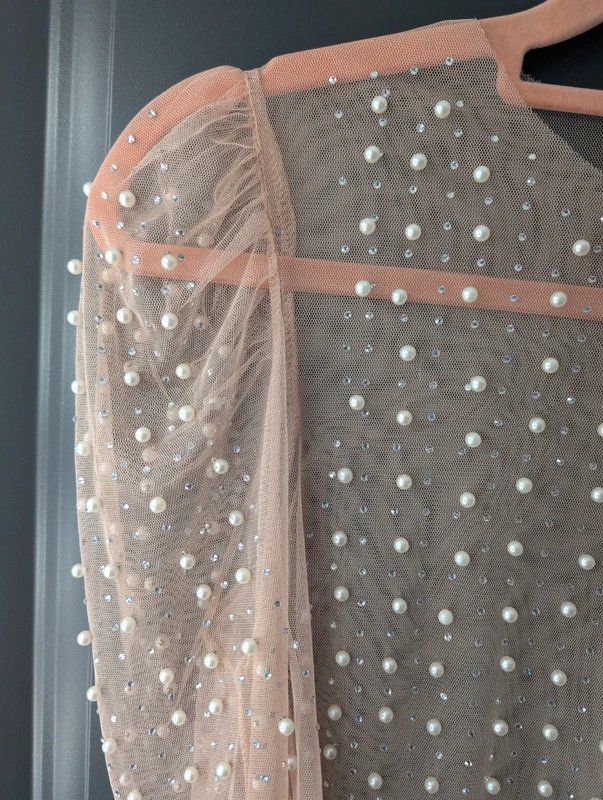 The nude tone sheer crop top is embellished with pearls and crystals. The delicate tulle fabric and shimmering details make it perfect for a touch of glamour.