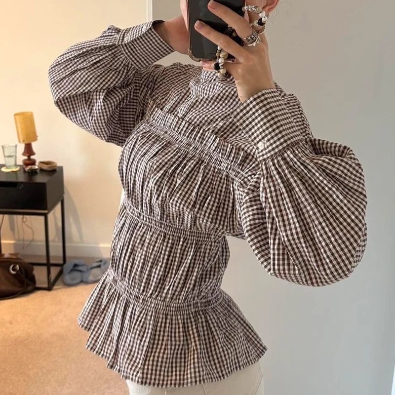 This brown & white gingham blouse with boat neck and balloon sleeves is a delightful piece. It features tiered ruching with a pleated hem and accentuated cuffs, adding a touch of vintage charm.