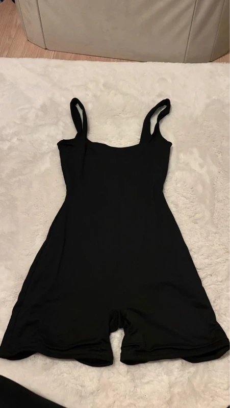 This short jumpsuit in black is a versatile piece, perfect for a casual day out or an evening gathering. The straps provide a stylish touch while ensuring a comfortable fit.