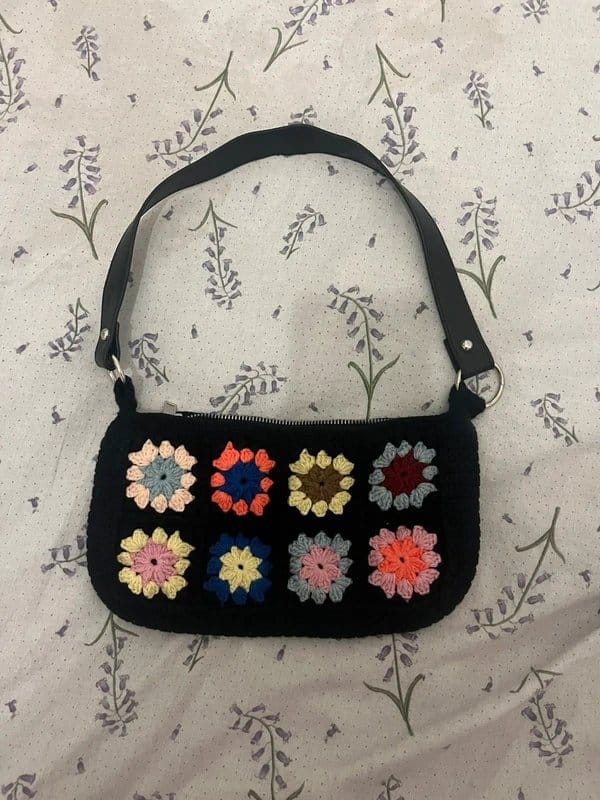 Charming crochet shoulder bag in black with a multi-coloured floral pattern. Ideal for spring/summer occasions.