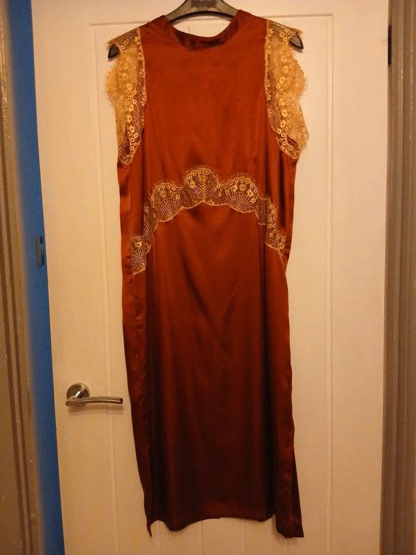 The ASOS Silk Copper Dress with Lace Detail is available in sizes M.