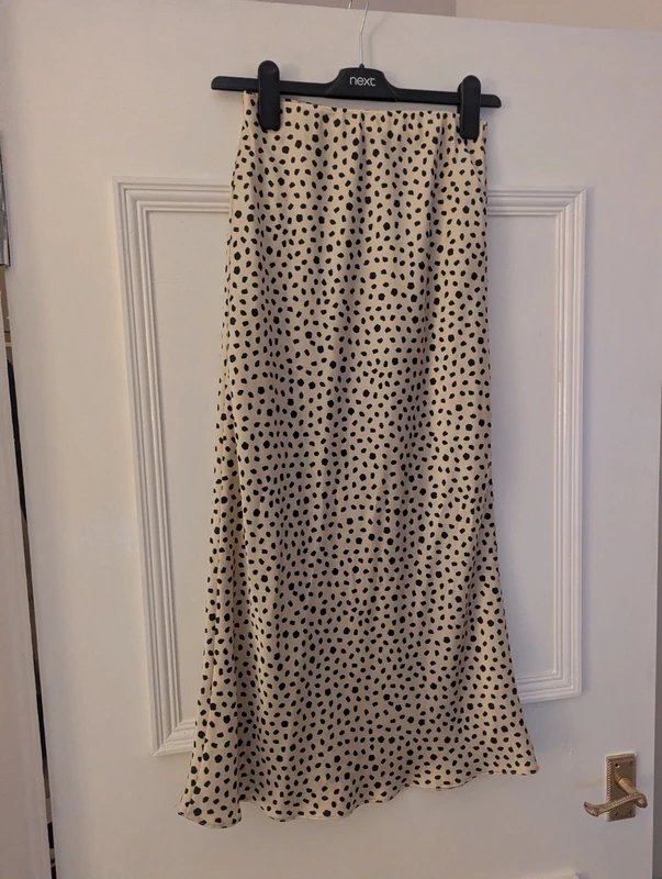 The ASOS silk midi skirt features an elastic waist for a very comfortable and flattering fit. The polka dot pattern in black and champagne adds a playful touch. Perfect for casual outings.