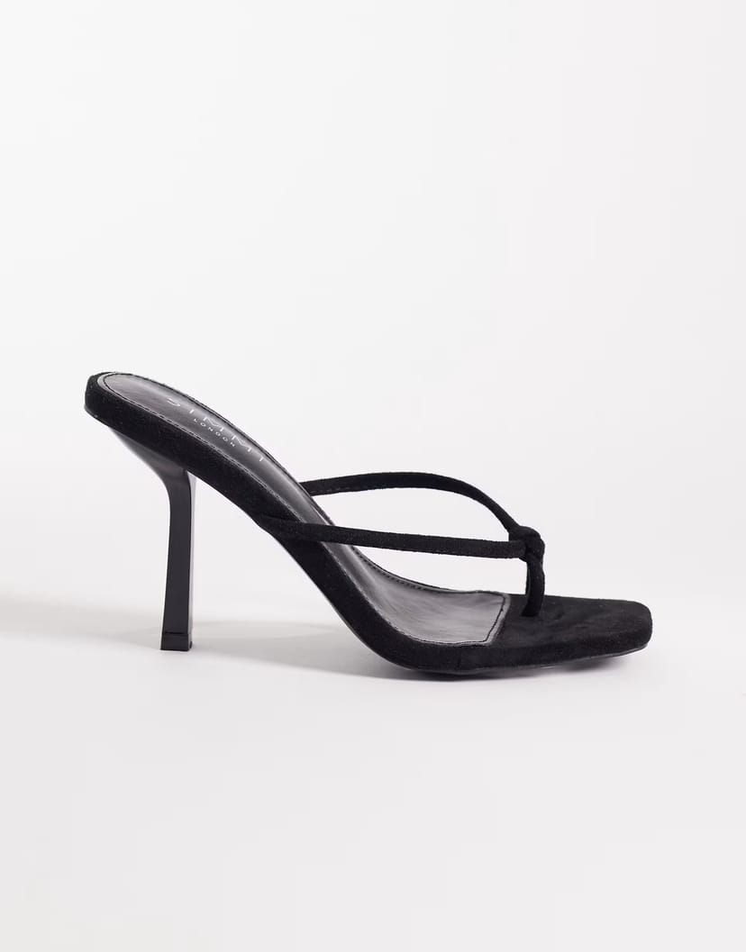 Sleek black suedette heeled mule sandals from Simmi London. Featuring a strappy design with a high stiletto heel and a pointed toe, these sandals are perfect for evening events or special occasions.