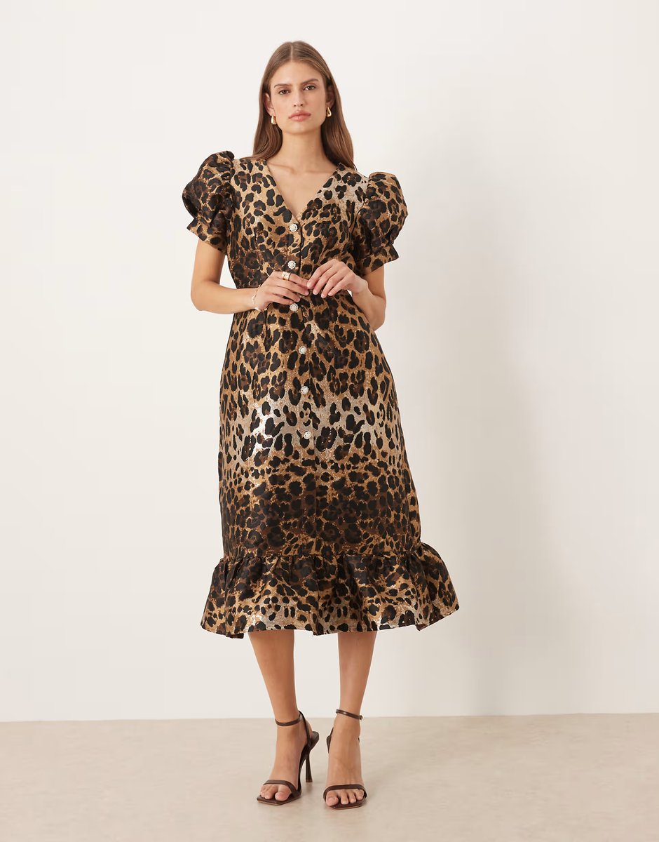 The ASOS Sister Jane Leopard Print Midi Dress in Brown is available in sizes XXXL, XXL, XL, XS, L, M, S.