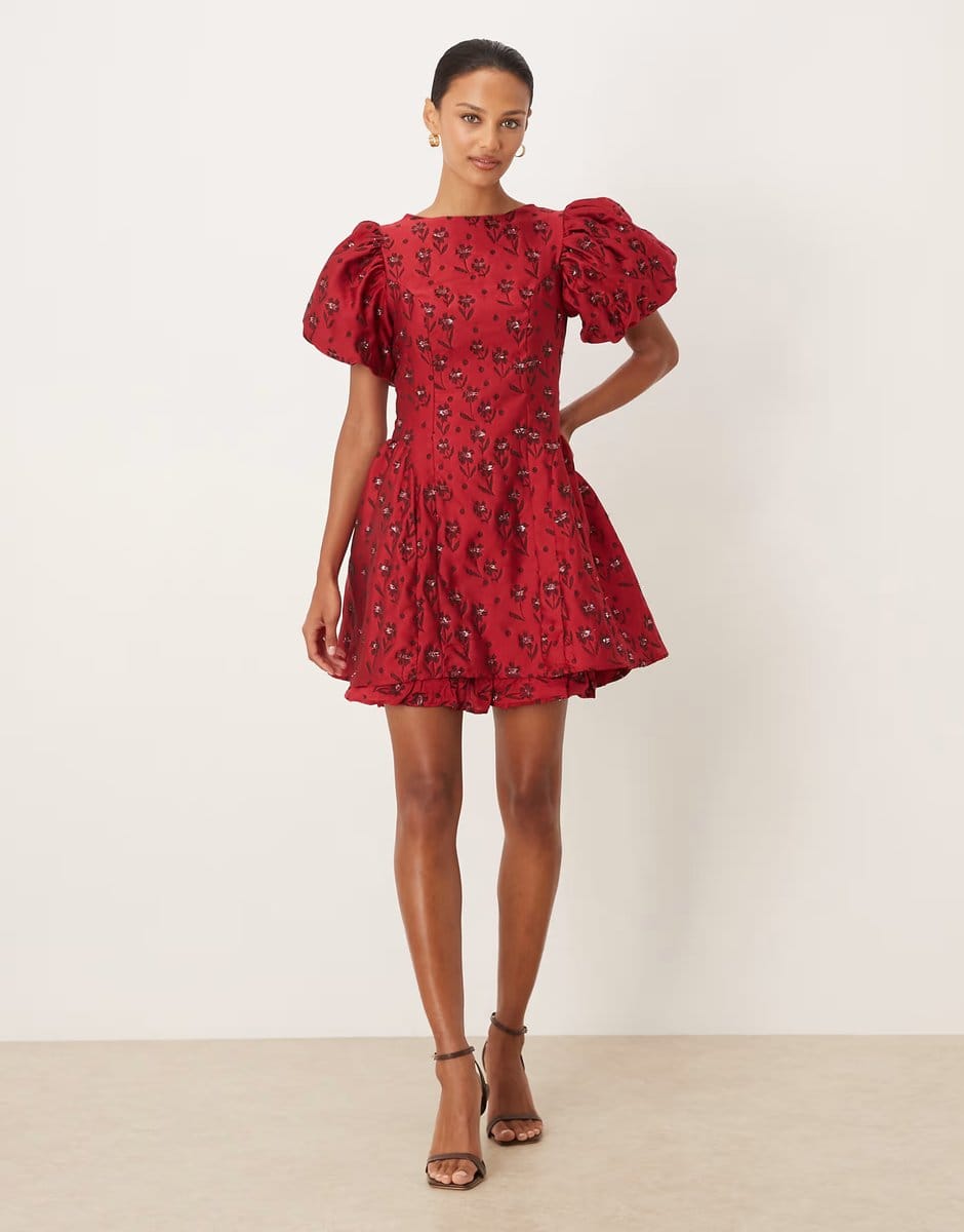 Designed with wine, puff sleeves, and a floral jacquard pattern, this mini dress from Sister Jane is perfect for any occasion.