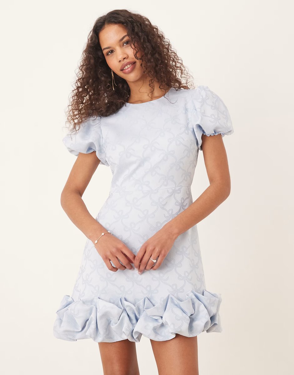 The powder blue puff hem jacquard mini dress by Sister Jane from ASOS is a stylish choice for any occasion. The dress features a scalloped hem and short sleeves, making it perfect for warm weather.