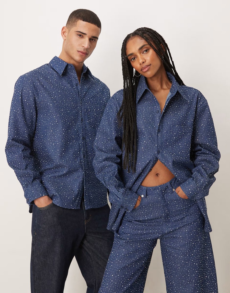 The ASOS Sister Jane Daze Embellished Denim Shirt Co-ord in Blue is available in sizes XXXL, XXL, XL, XS, L, M, S.