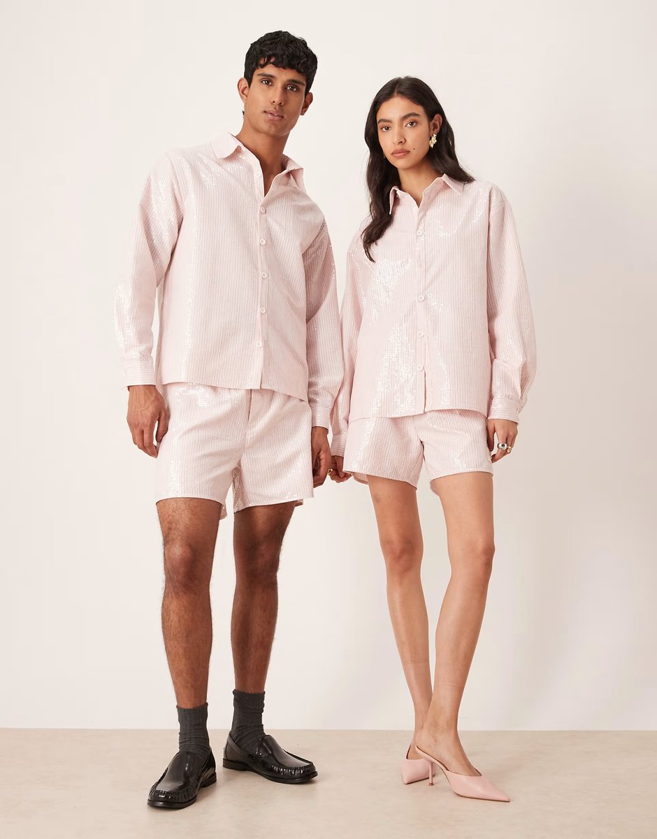 The ASOS Sister Jane Light Pink Sequined Shorts Co-ord is available in sizes XXXL, XXL, XL, XS, L, M, S.