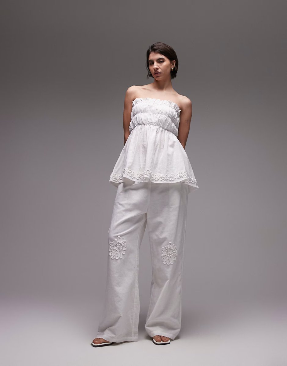 Designed with ruched detailing on the bandeau top and wide leg trousers, this linen blend co-ord is perfect for a casual, elegant look. The flower applique adds a delicate touch, making it ideal for warm weather outings.