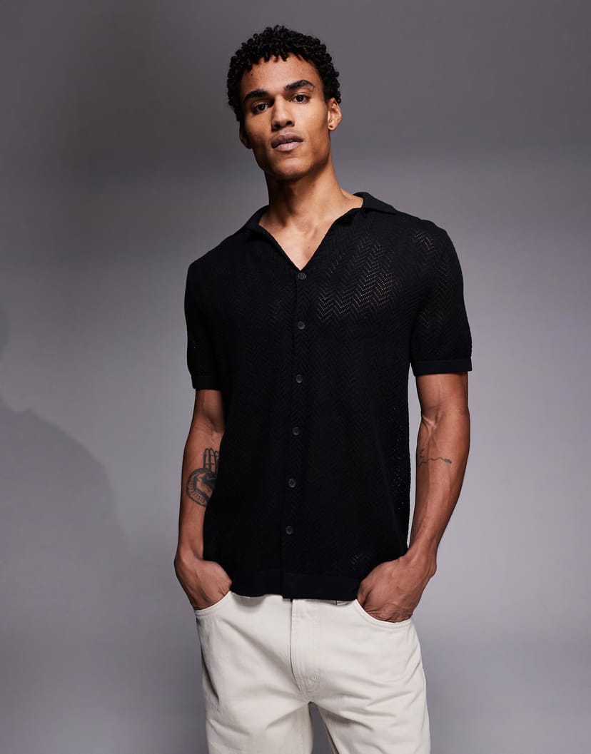The ASOS South Beach Crochet Rever Shirt in Black is available in sizes XXXL, XXL, XL, XS, L, M, S.