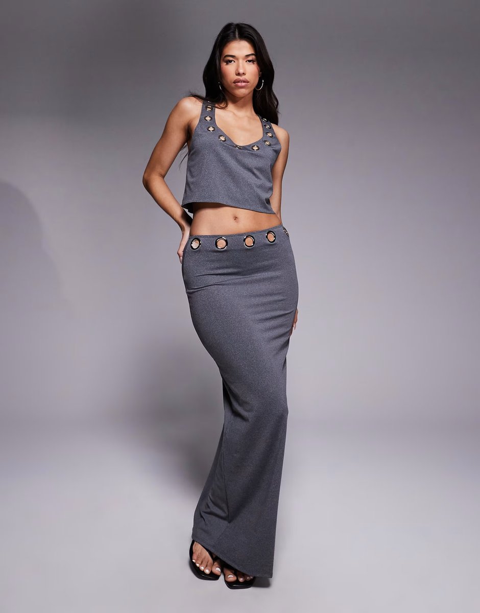 The ASOS South Beach Maxi Beach Skirt with Eyelet Detail in Grey is available in sizes XXXL, XXL, XL, XS, L, M, S.