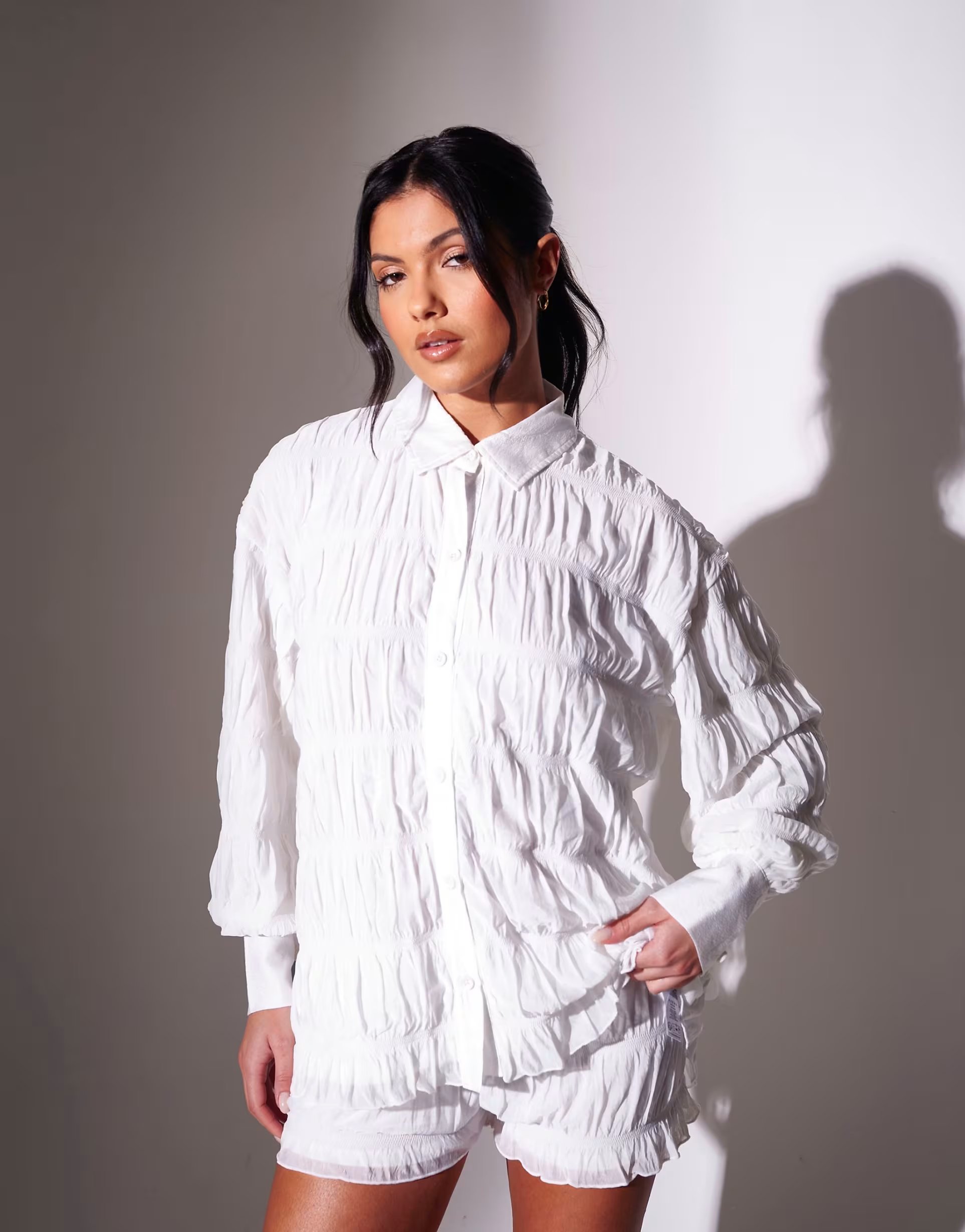 A chic and versatile outfit featuring a ruched long sleeve shirt and matching mini shorts. Crafted from a lightweight fabric, this co-ord is perfect for casual outings or layering.