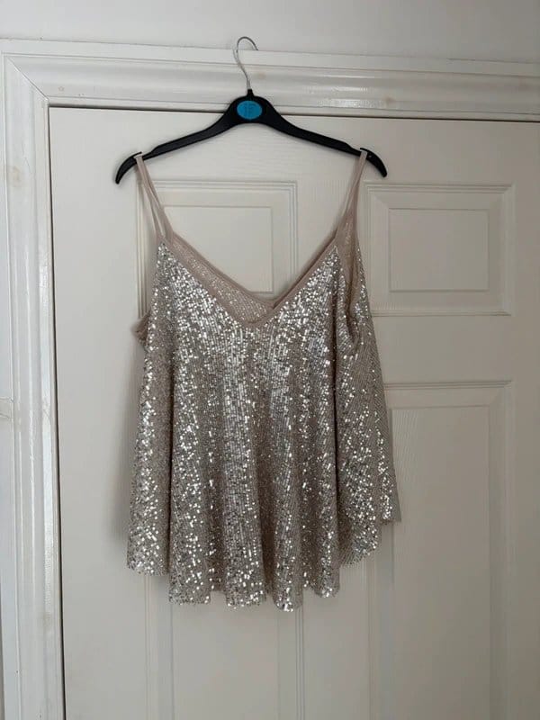 The ASOS Silver Sequin Sleeveless Top is available in sizes M.