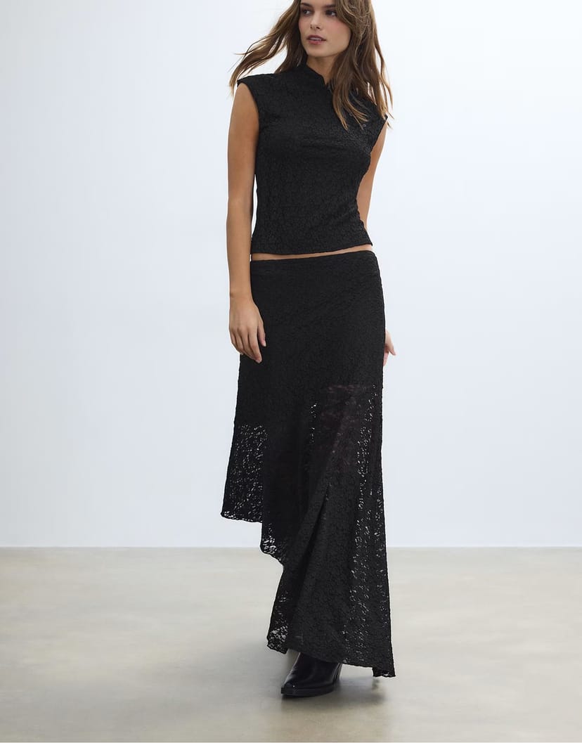 The ASOS Black Lace Asymmetric Midi Skirt Set is ideal for evening, date-night, party.