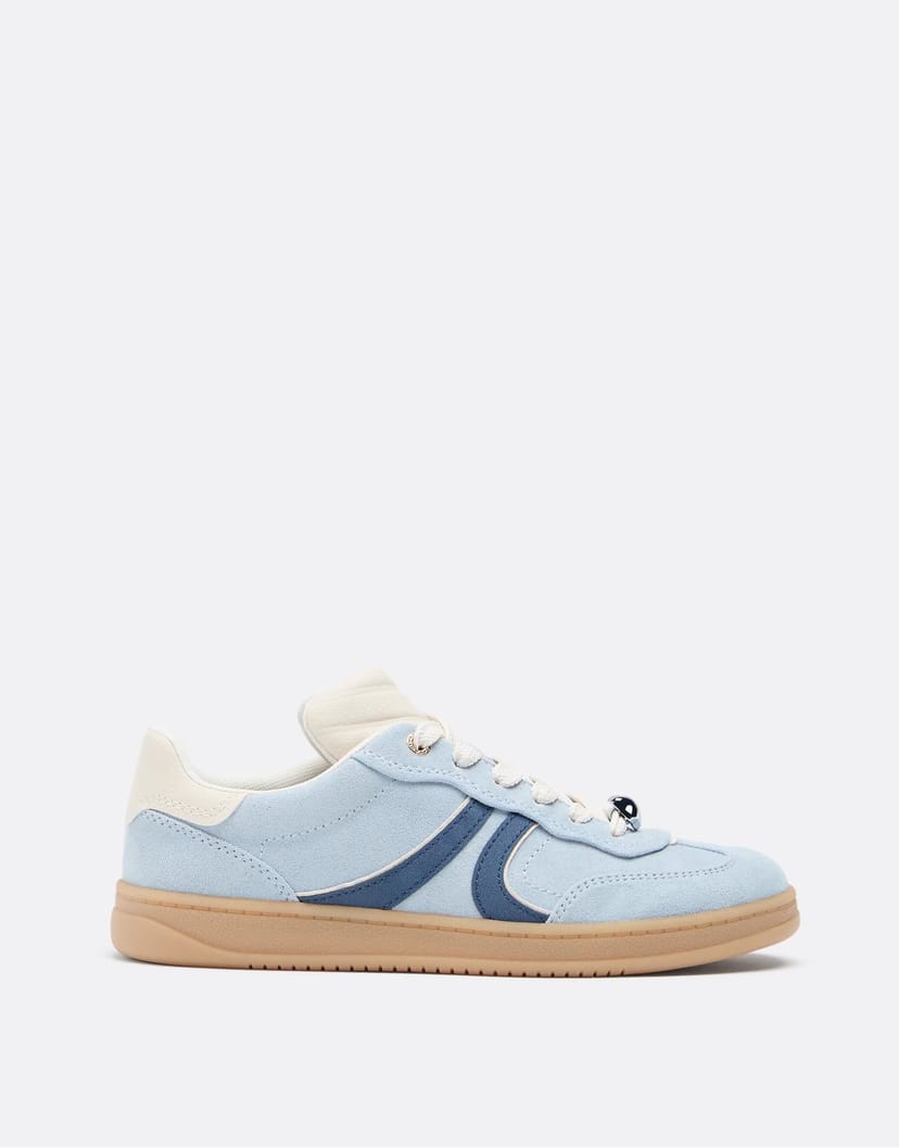 Casual ASOS trainers in light blue suede with navy blue stripes. Features a white toe and heel, silver buckle, and a beige sole. Perfect for everyday wear.
