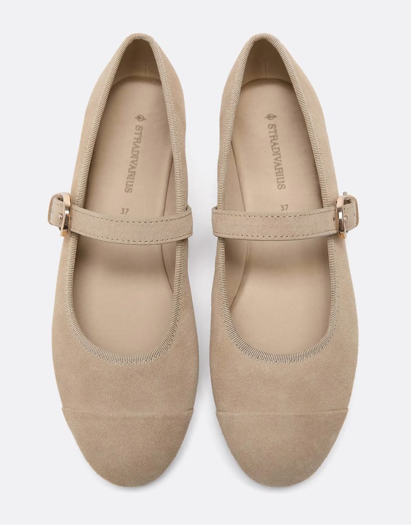 Chic beige suede leather ballerina flats with a leather toecap and gold buckles. Perfect for a polished and elegant look.