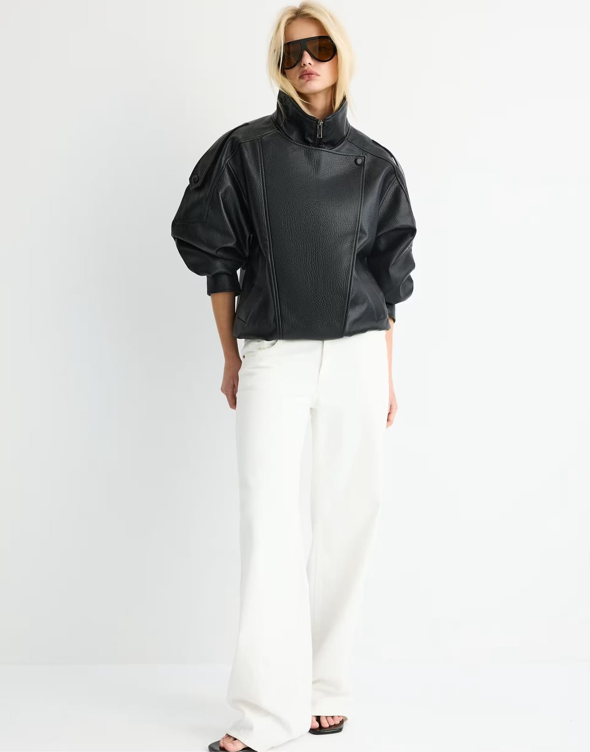 This ASOS faux leather biker jacket in black features an oversized fit, puff sleeves, and a zip front closure. Ideal for a modern, edgy look.