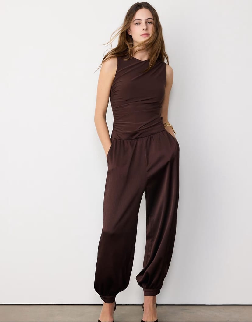 The ASOS Brown Satin Halter Jumpsuit is made from satin.