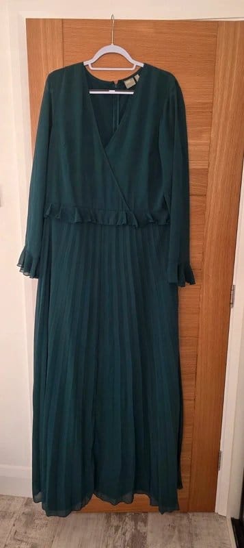 A stunning ASOS formal dress in a gorgeous shade of dark green. Featuring a mock wrap bodice and pleated skirt, this dress falls beautifully. The long sheer sleeves add an elegant touch. Made from fully lined chiffon material, it is perfect for formal events.