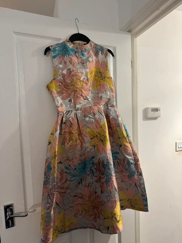 A dazzling sleeveless A-line dress from ASOS, crafted in a shimmering silver/metallic jacquard fabric. The dress features a bold, large-scale floral pattern in soft pink, coral, mustard yellow, and turquoise/blue tones. The flowers have a beautiful textured, almost 3D brocade effect that catches the light beautifully.