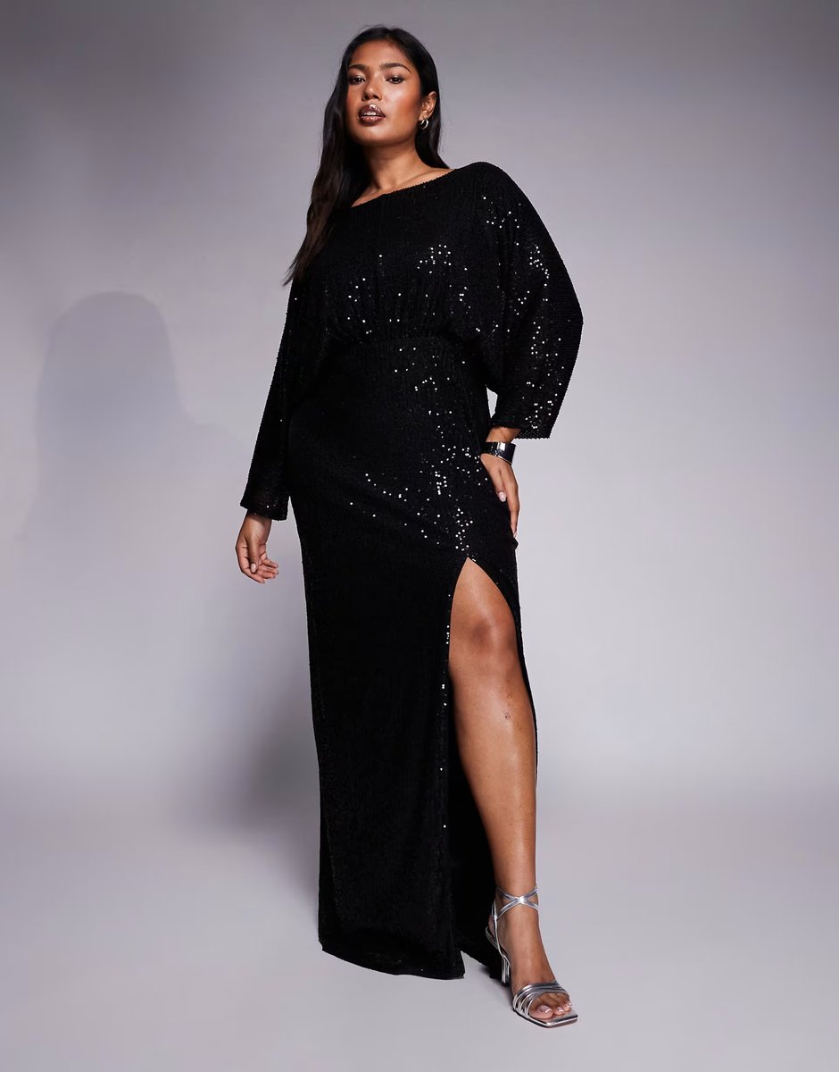 The (TFNC Plus Sequin Kimono Top Maxi Dress in Black) is available in sizes XXXL, XXL, XL, XS, L, M, S.