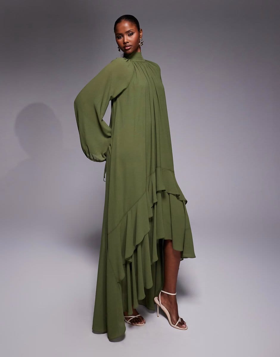 This khaki maxi dress from ASOS TFNC is a stunning piece, featuring balloon sleeves and a high-low hem for a unique silhouette. Perfect for an elegant evening out.
