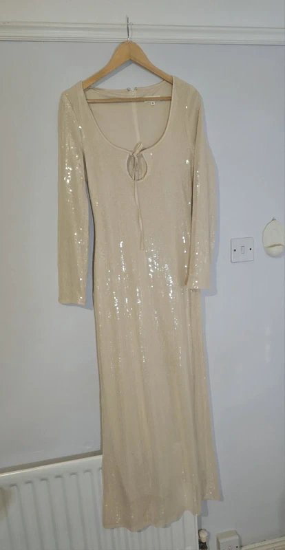 The ASOS Gold Sequin Maxi Dress is available in sizes M.