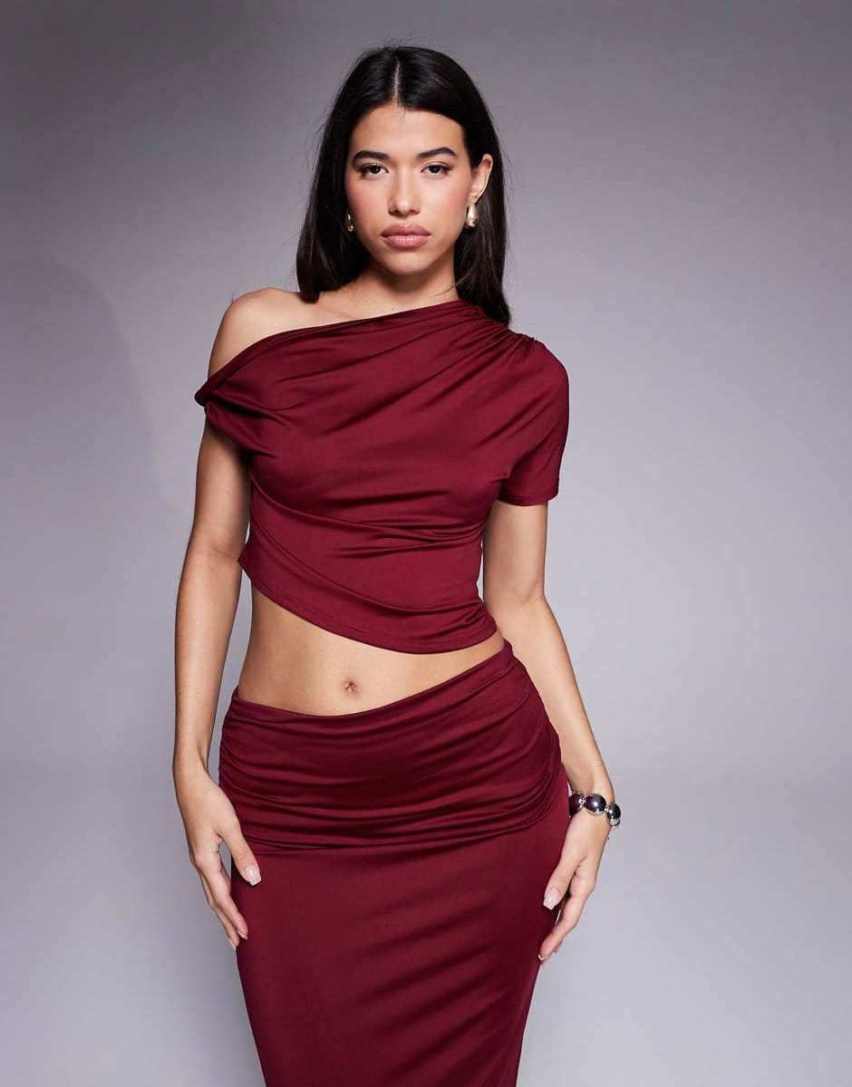 The Frolic exclusive double sculpted, slinky off-shoulder twist detail asymmetric crop top co-ord in burgundy. Designed with off-shoulder, twist detail, and slinky fabric, this piece is perfect for adding a touch of drama to any outfit.
