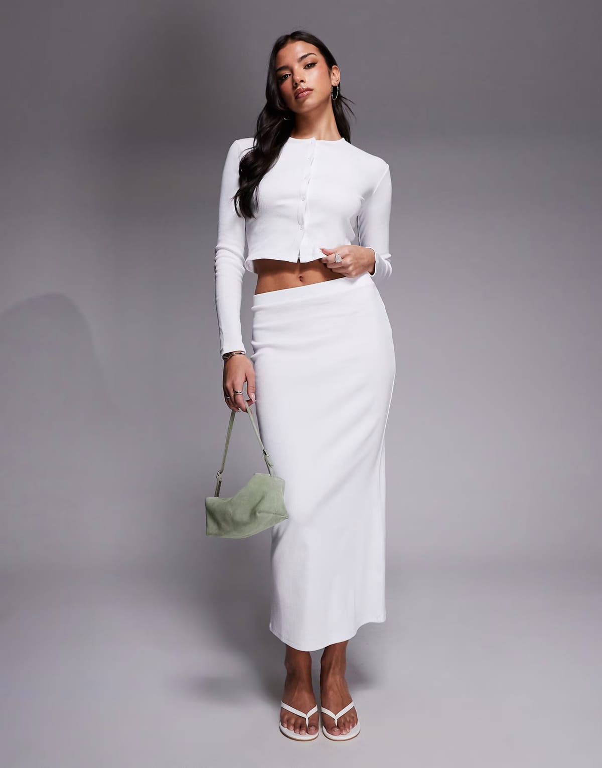 The ASOS The Frolic Ribbed Long Sleeve Top with Maxi Skirt in White is made from ribbed fabric.