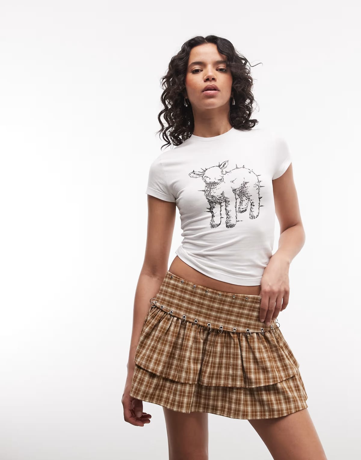 The ASOS Tan Check Ruffle Mini Skirt with Hardware is ideal for casual, outings, night out.