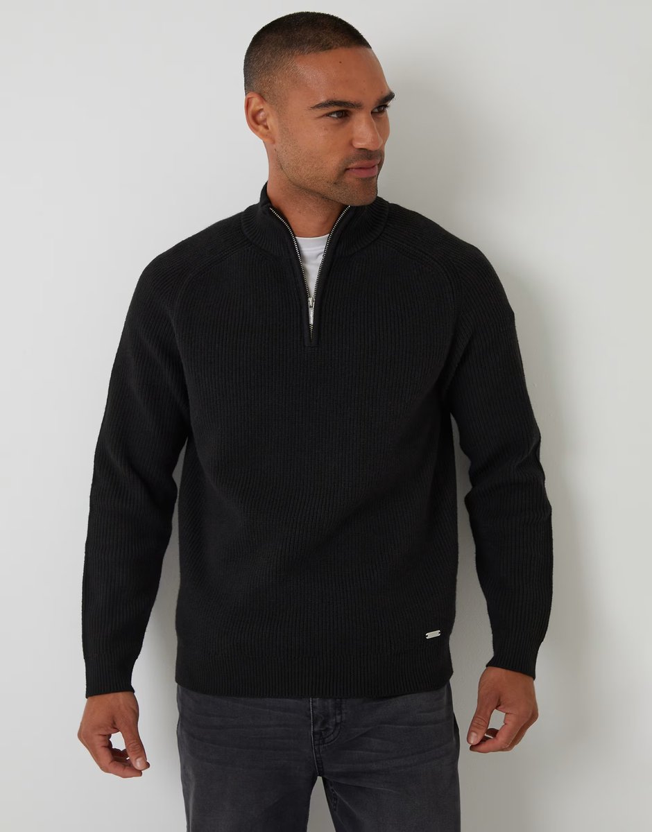 The ASOS Quarter Zip Ribbed Knit Jumper in Black is available in sizes XXXL, XXL, XL, XS, L, M, S.