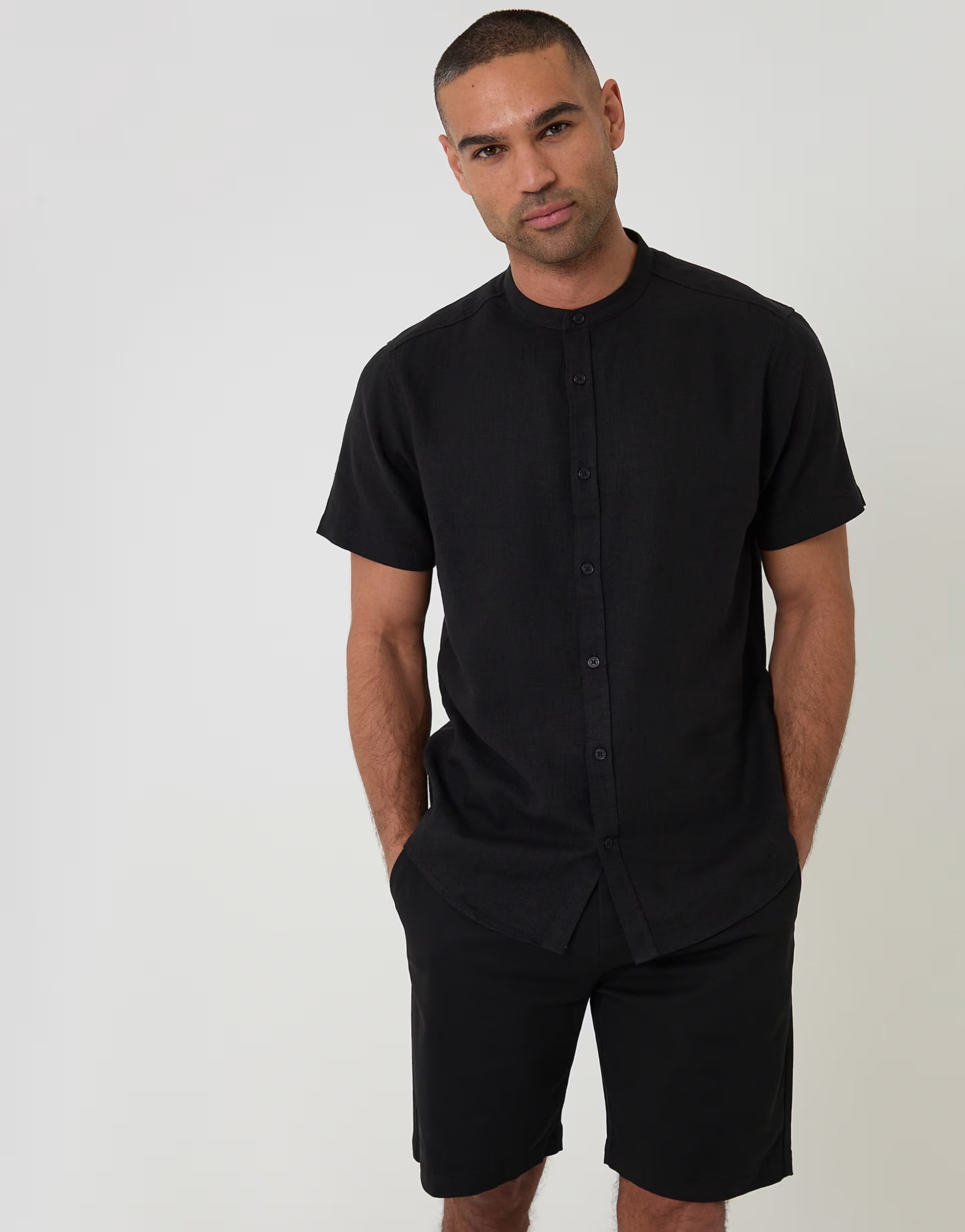 The ASOS Grandad Collar Linen Blend Shirt in Black is available in sizes XXXL, XXL, XL, XS, L, M, S.