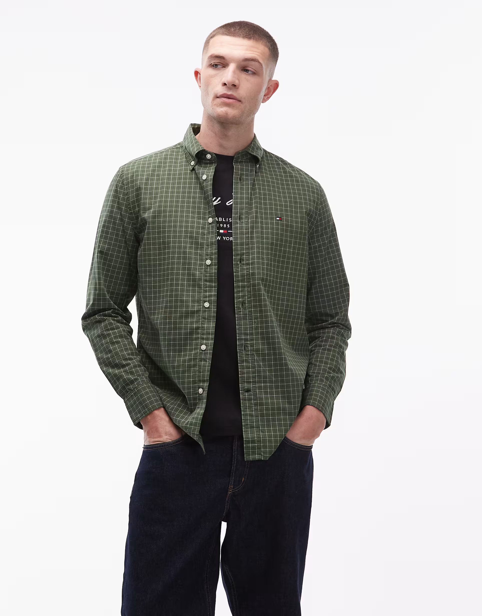 This green checked poplin shirt from Tommy Hilfiger at ASOS features a button-down collar and long sleeves. Ideal for layering, it adds a stylish touch to any casual or business-casual ensemble.