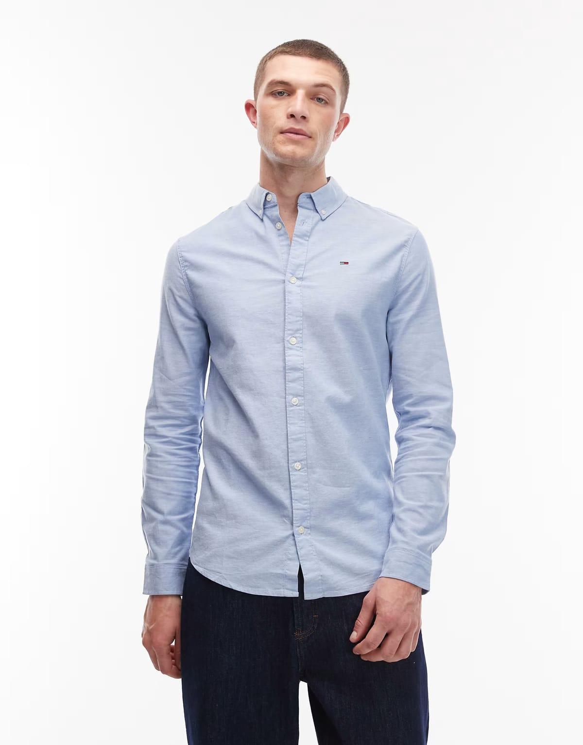 The ASOS Tommy Jeans Slim Stretch Oxford Shirt in Blue is available in sizes XXXL, XXL, XL, XS, L, M, S.