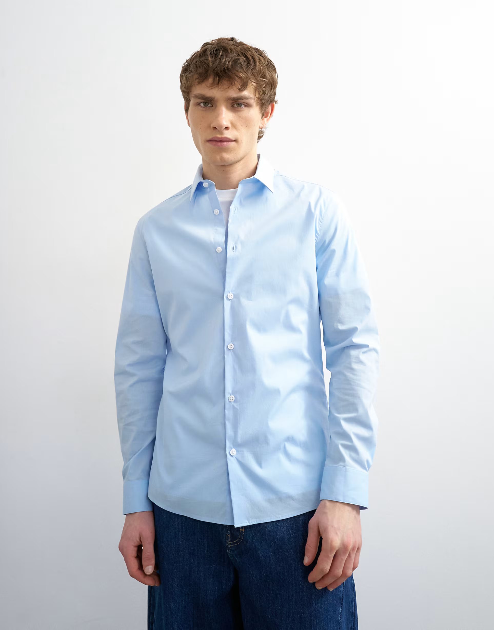 Designed with a light blue hue, this long sleeve formal stretch shirt features a slim fit and a button-down front, perfect for both work and casual occasions.