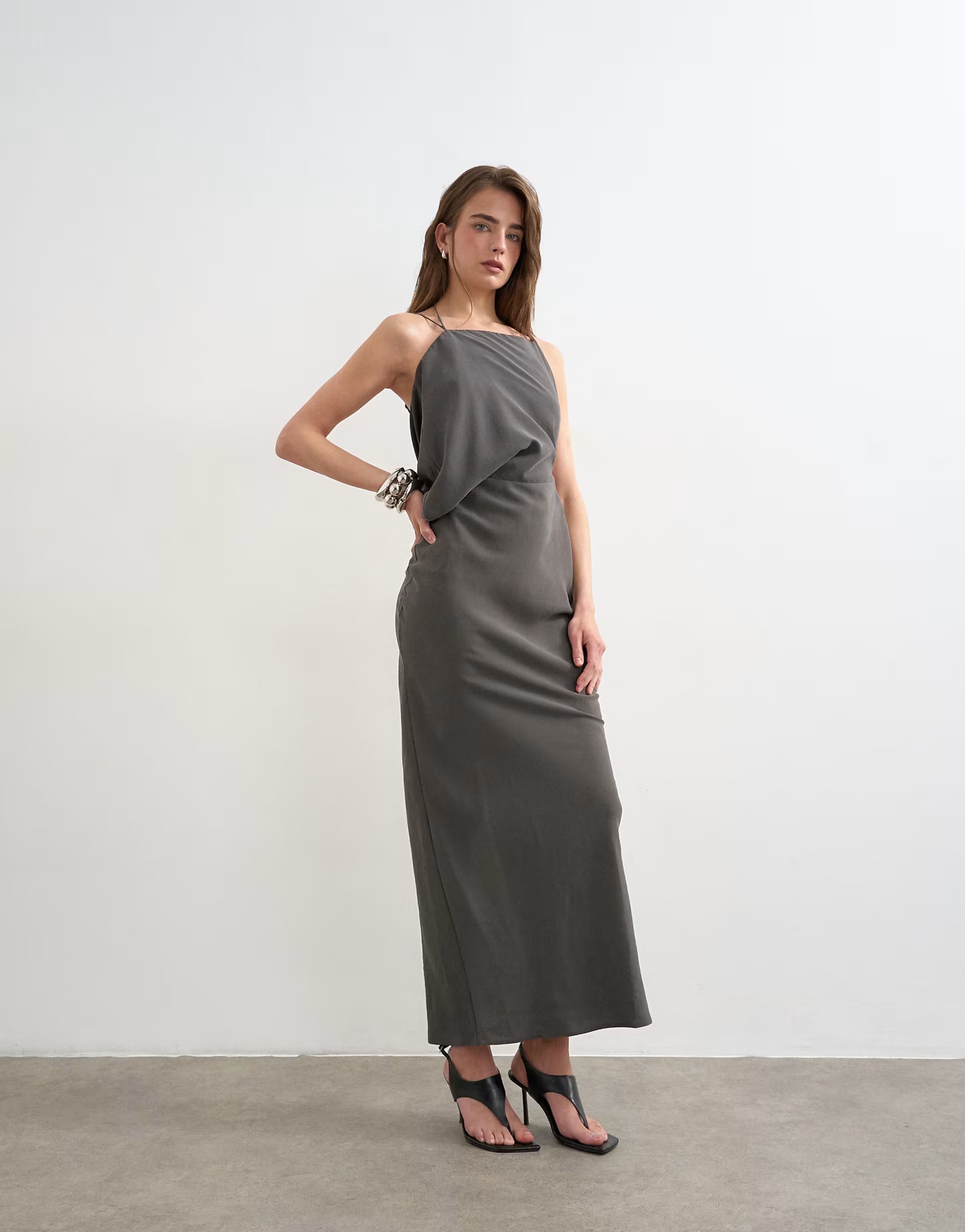 This grey maxi dress by ASOS features an asymmetrical neckline and ruched side detail. Perfect for evening events or smart-casual outings.
