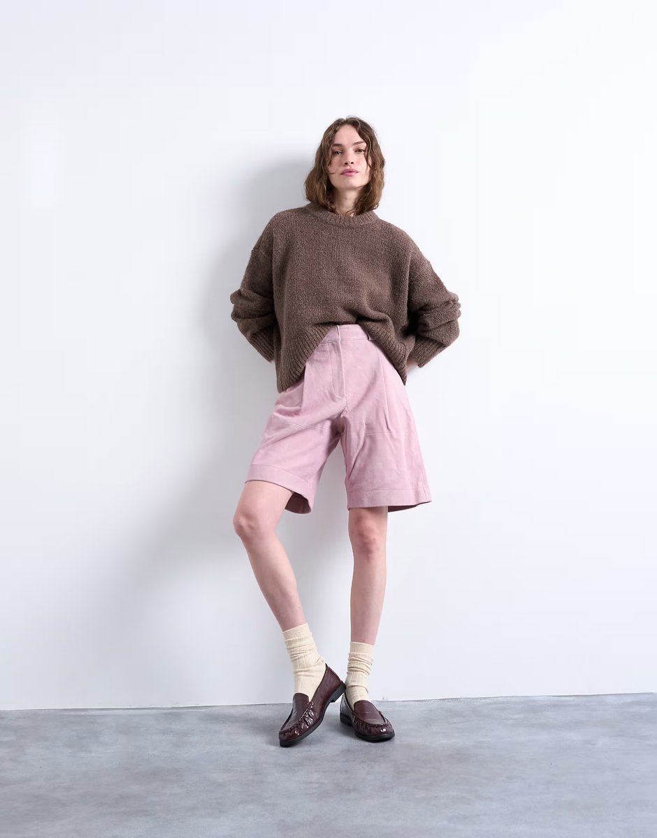 Pink Suede Longline Shorts — a perfect blend of comfort and style. Designed in pink, these longline shorts feature a premium suede material, offering a luxurious feel. The high-rise waist and cropped length provide a flattering fit, making them perfect for casual outings or paired with a sweater for a cozy yet chic look. Includes practical pockets for convenience.