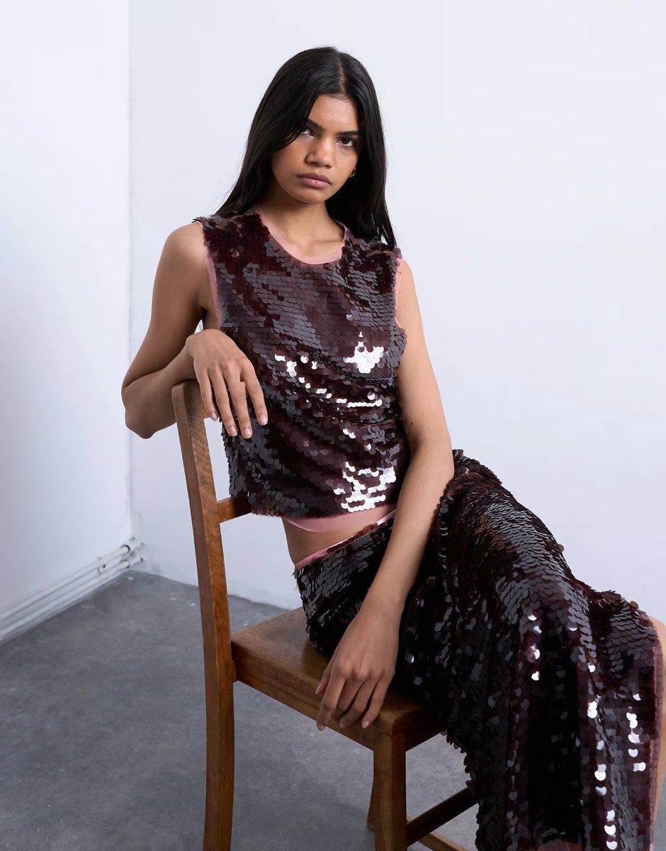 The ASOS Topshop Wine Sequin Contrast Shell Top is ideal for evening, party.