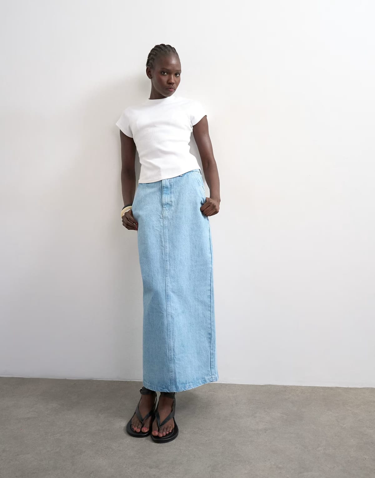The ASOS Denim Column Skirt in Bleach is ideal for casual.
