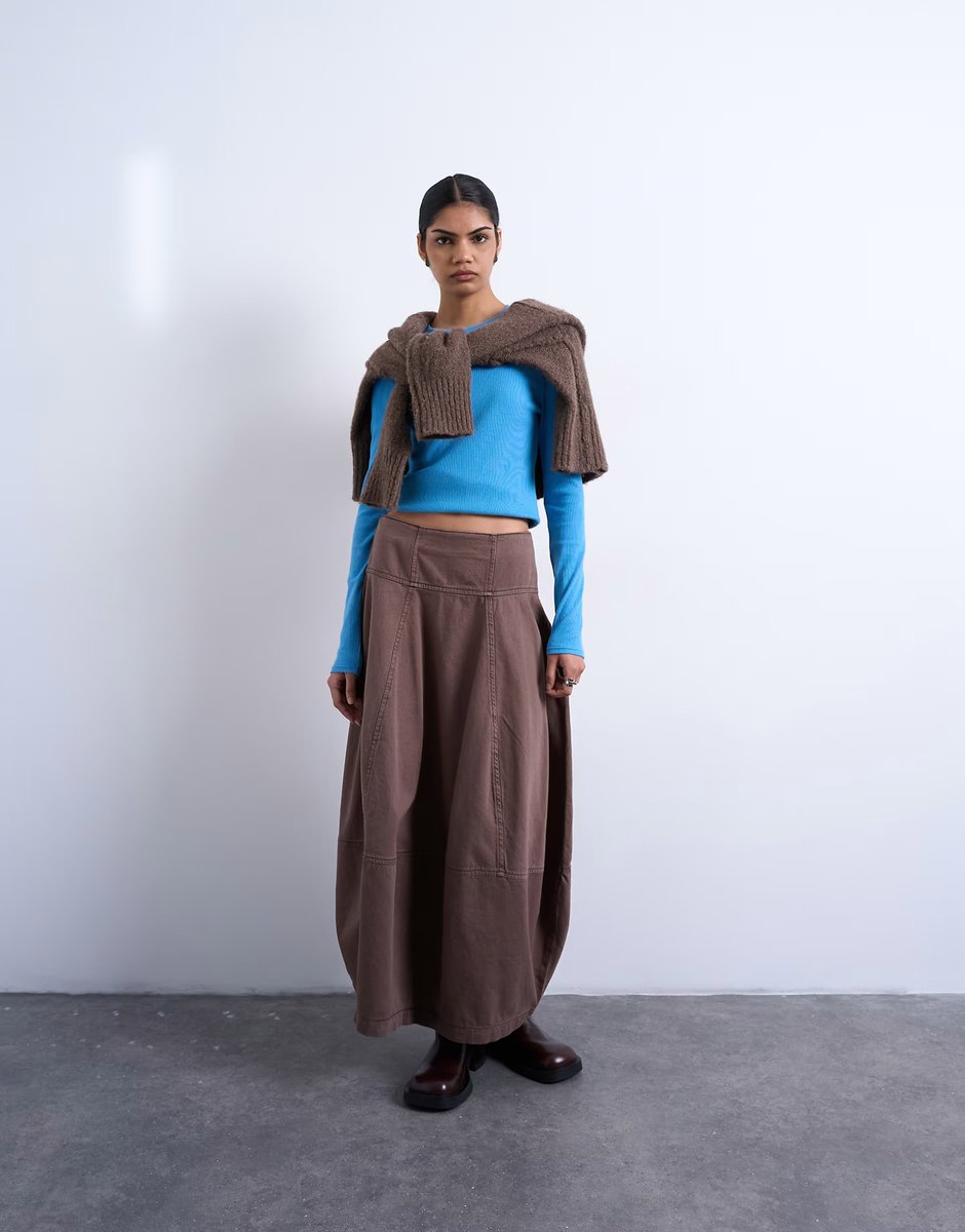 The ASOS Denim Seamed Barrel Maxi Skirt in Otter is available in sizes XXXL, XXL, XL, XS, L, M, S.