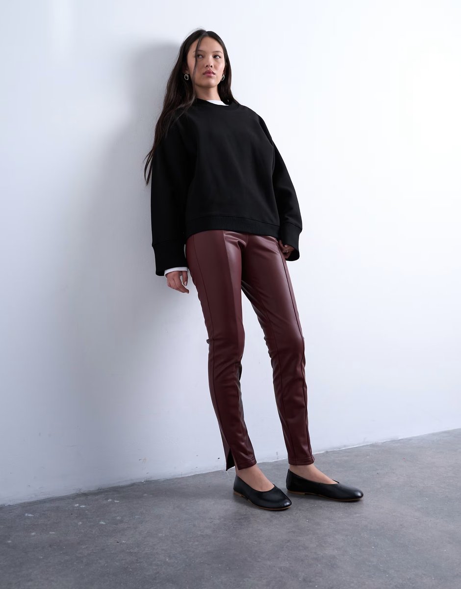 The ASOS Faux Leather Skinny Trousers in Burgundy is ideal for work, smart-casual, evening.